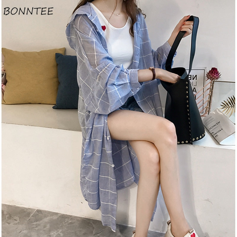 Shirts Women Plaid Simple All-match Soft Korean Style Turn-Down Clothing Womens Summer Loose Elegant Vacation Sun Shade Ladies