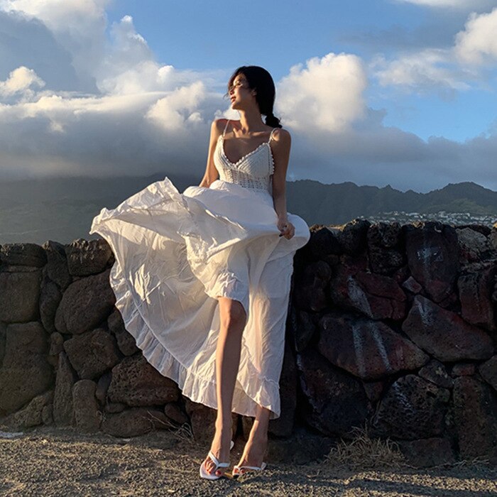 • Load image into Gallery viewer, Beachwear For Women Beach Suit Cover-Ups Korean Ins New Neck Halter Skirt Sexy Backless Hollow Dress Solid Cotton Fmzxg Tunic